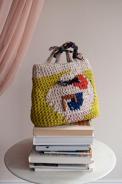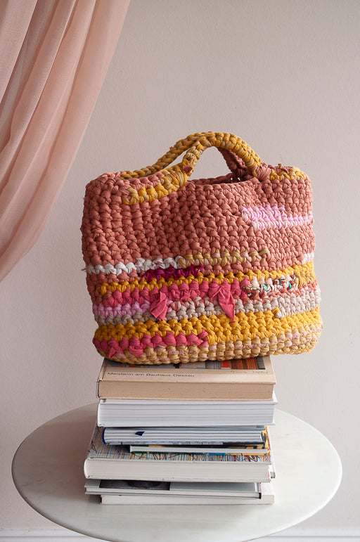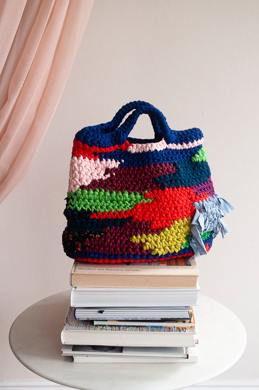 Verliebe dich in Deine Re-Bag. Jede ist ein Unikat. Jede mit viel Gefühl für Farbe und Materialien entworfen und von Hand gehäkelt. Wir verwenden Recyclinggarne, alte T-Shirts und neuerdings auch Reste der Produktion von Mumutane-Kissen - also super hochwertige wunderschöne Stoffetzen aus afrikanischen Wachsprints. Sie sind immer nur limitiert erhältlich.