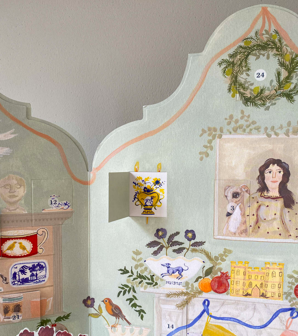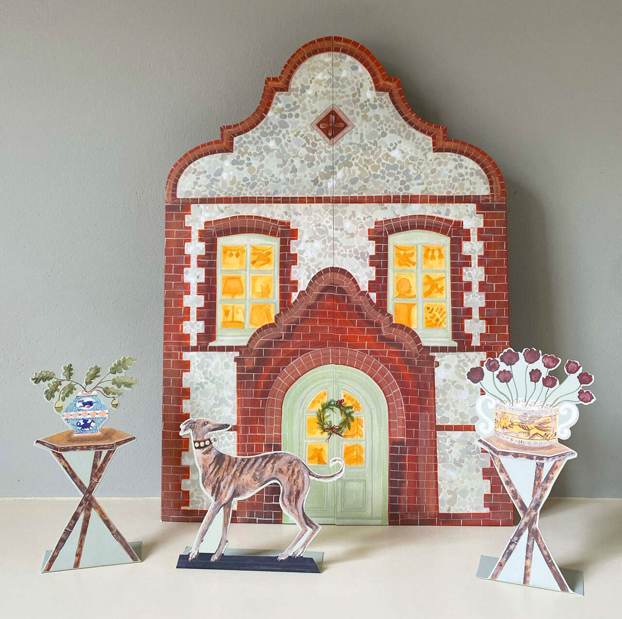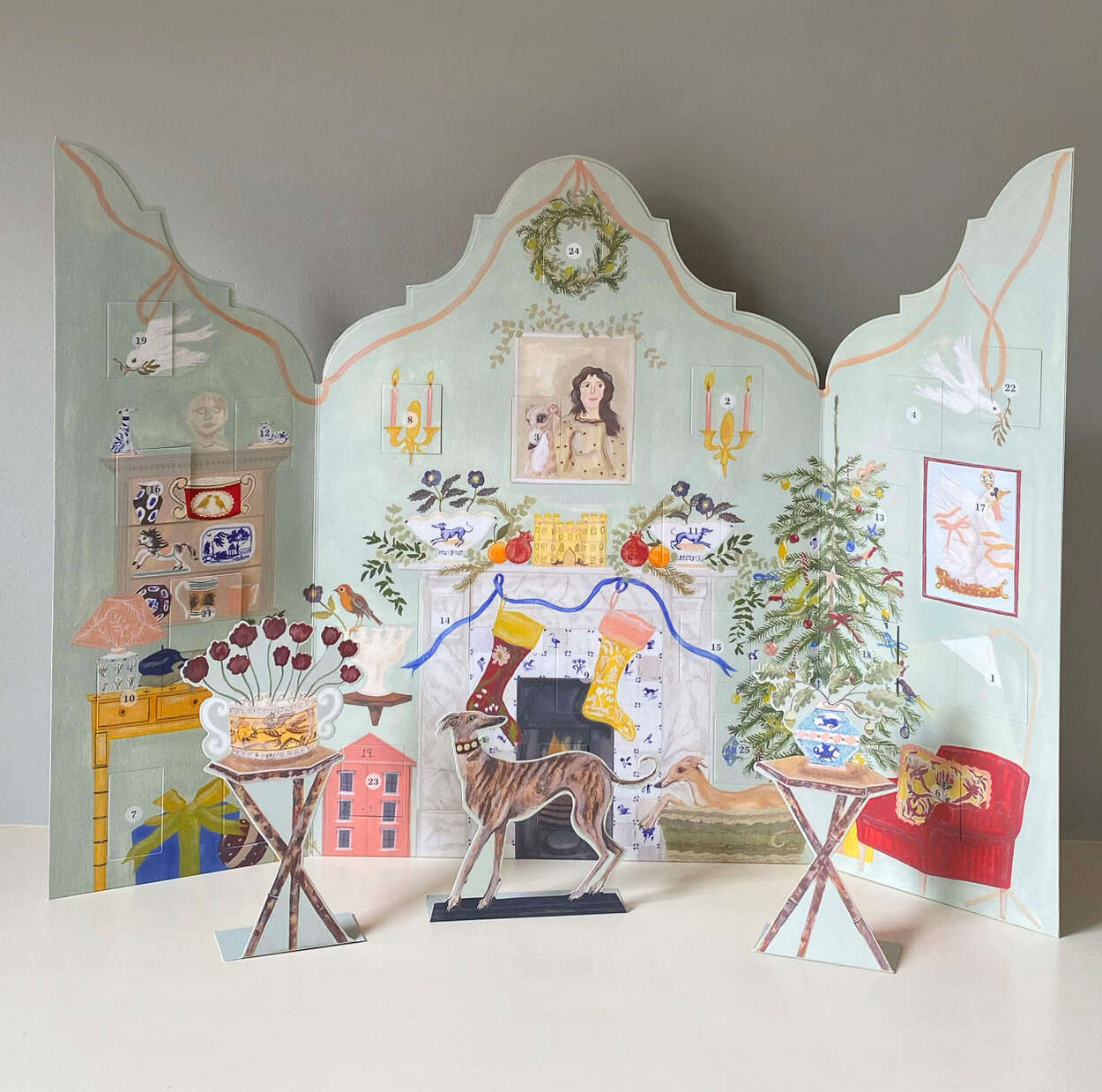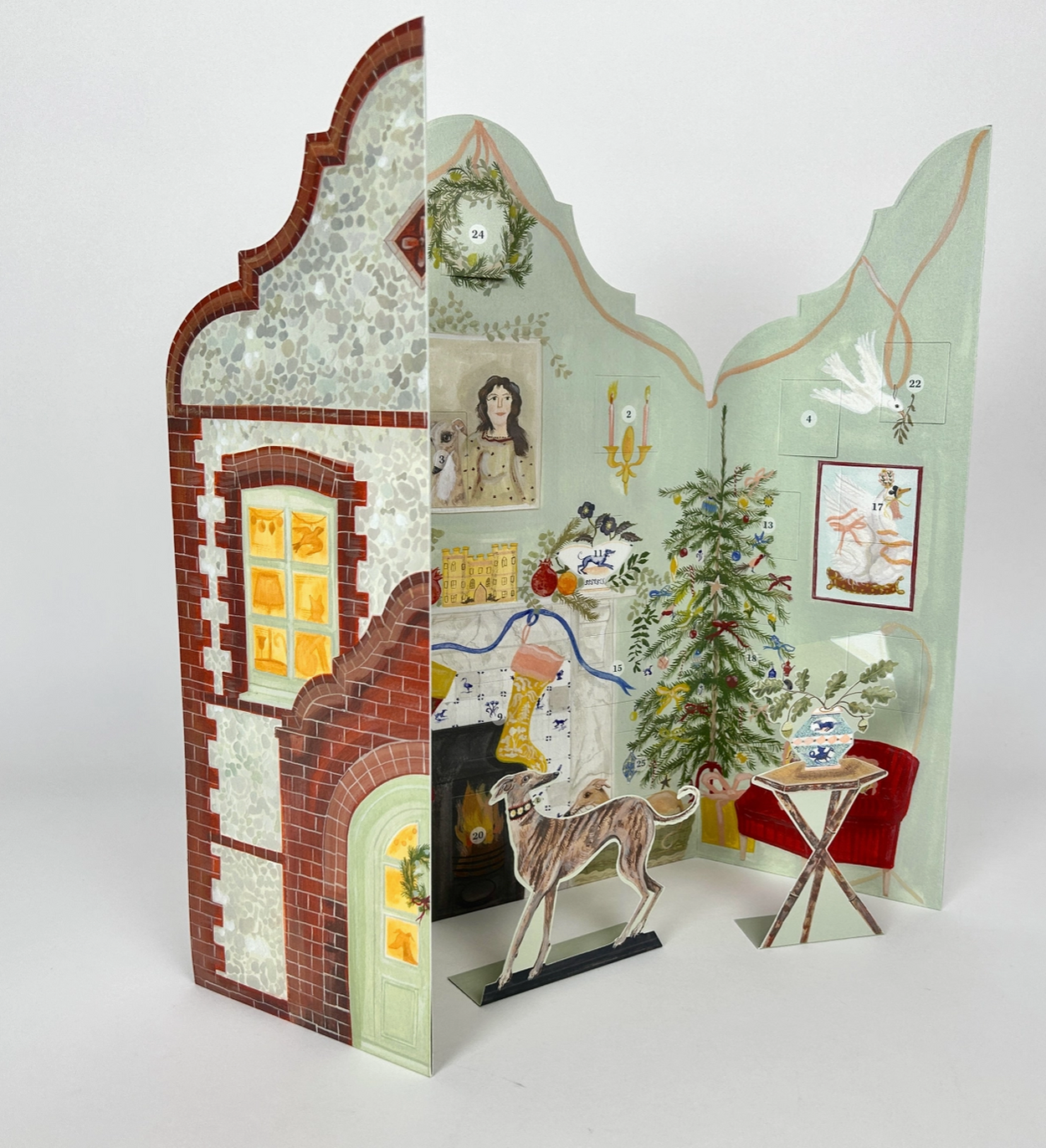 Ein freistehender, handgefertigter Adventskalender. Mit 25 Türen zum Öffnen in der Vorweihnachtszeit. Hinter jeder Tür verbirgt sich eine Illustration. Diese Geschenke werden flach ausgehängt und können aufgeklappt werden, um ein Haus zu schaffen. Sie werden mit drei zusätzlichen ausklappbaren Papierstücken geliefert, darunter zwei antike Bambustische, die mit romantischen Vasen und Blumen geschmückt sind, und ein aufklappbarer Whippet.