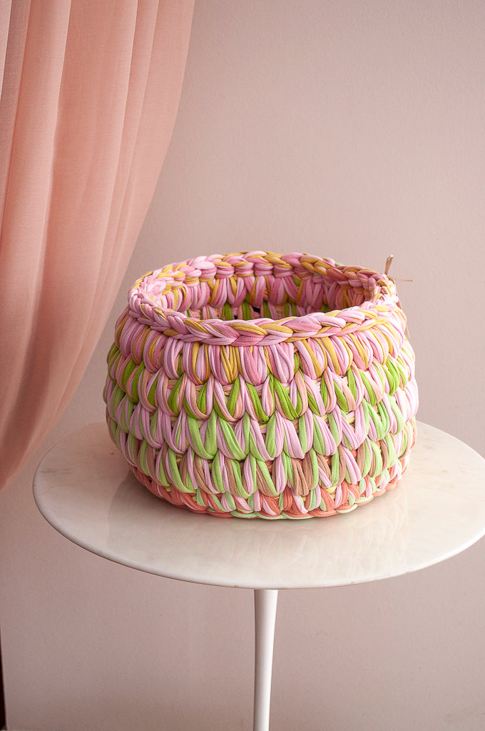Sie werden in unglaublicher Handarbeit in unserem Partnerprojekt in Griechenland aus textilen Reststoffen angefertigt, die direkt dort vor Ort in einer T-Shirt Färberei entstehen. Wir kombinieren immer wieder neu: Farben, Texturen und so entstehen wunderschöne Einzelstücke.