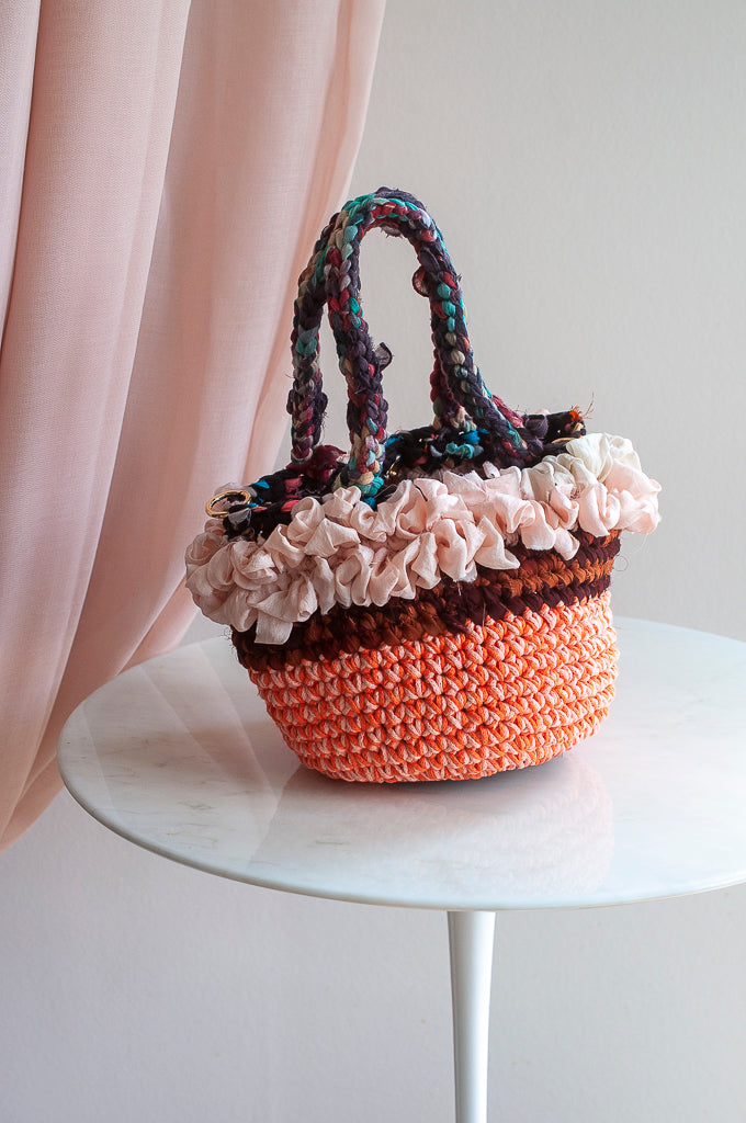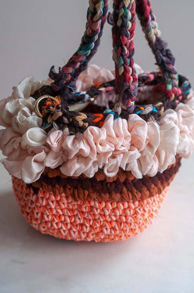 Sie ist entstanden aus Resten alter Seide, alten Kopftüchern, die die Frauen in unserem Partnerprojekt in Griechenland in zwei alten Koffern fanden und Resten von Papiergarn. Dadurch ist sie federleicht und sehr schön zu tragen - allerdings nur bedingt waschbar. Sie möchte aber auch gar nicht gewaschen werden, sondern getragen - abends oder tagsüber als It-Piece. Unsere gehäkelten Taschen aus Recyclingmaterial sind einzigartig und nur begrenzt verfügbar. Jede ist ein Unikat.
