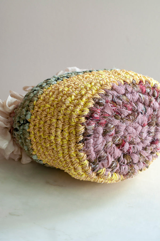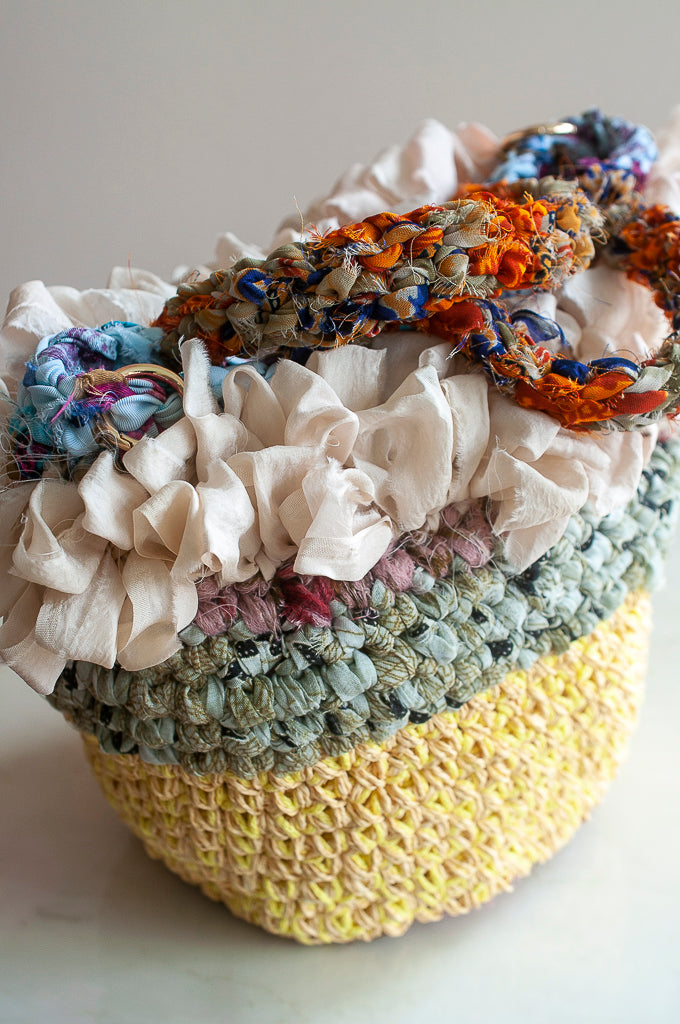 Material: Reste von Seide, Papiergarn und Second-Hand Kopftüchern aus Materialmix