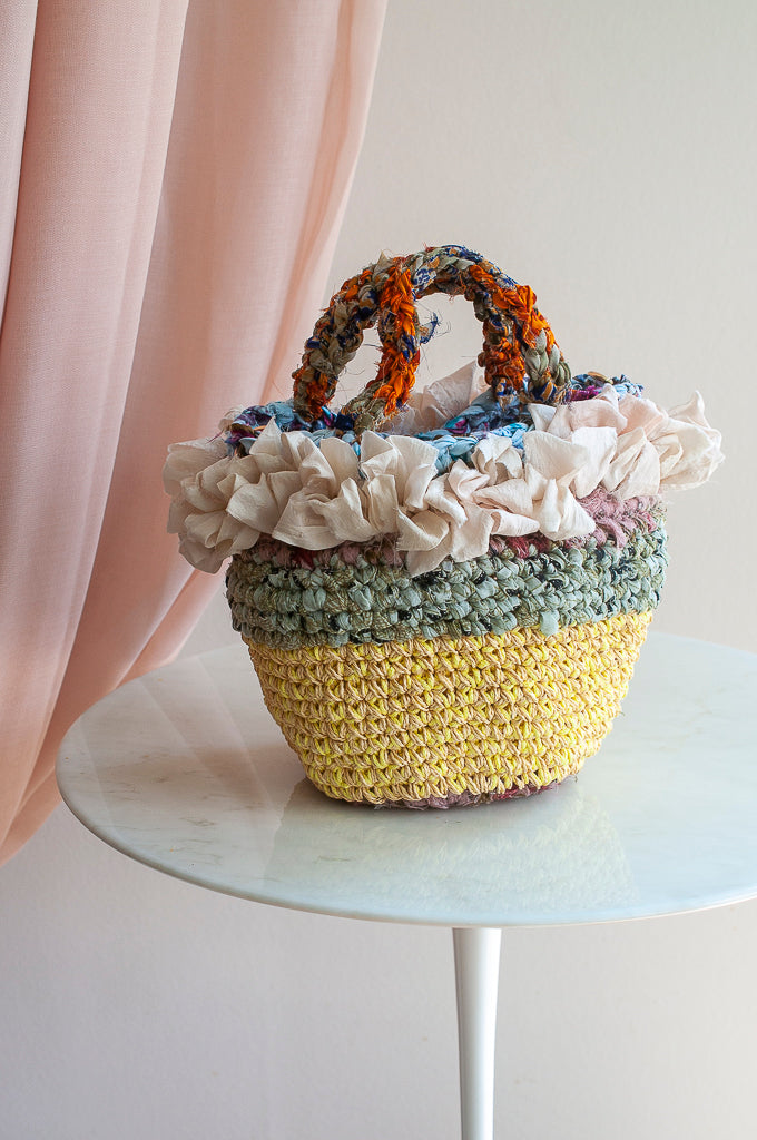 Sie ist entstanden aus Resten alter Seide, alten Kopftüchern, die die Frauen in unserem Partnerprojekt in Griechenland in zwei alten Koffern fanden und Resten von Papiergarn. Dadurch ist sie federleicht und sehr schön zu tragen - allerdings nur bedingt waschbar. Sie möchte aber auch gar nicht gewaschen werden, sondern getragen - abends oder tagsüber als It-Piece. Unsere gehäkelten Taschen aus Recyclingmaterial sind einzigartig und nur begrenzt verfügbar. Jede ist ein Unikat.