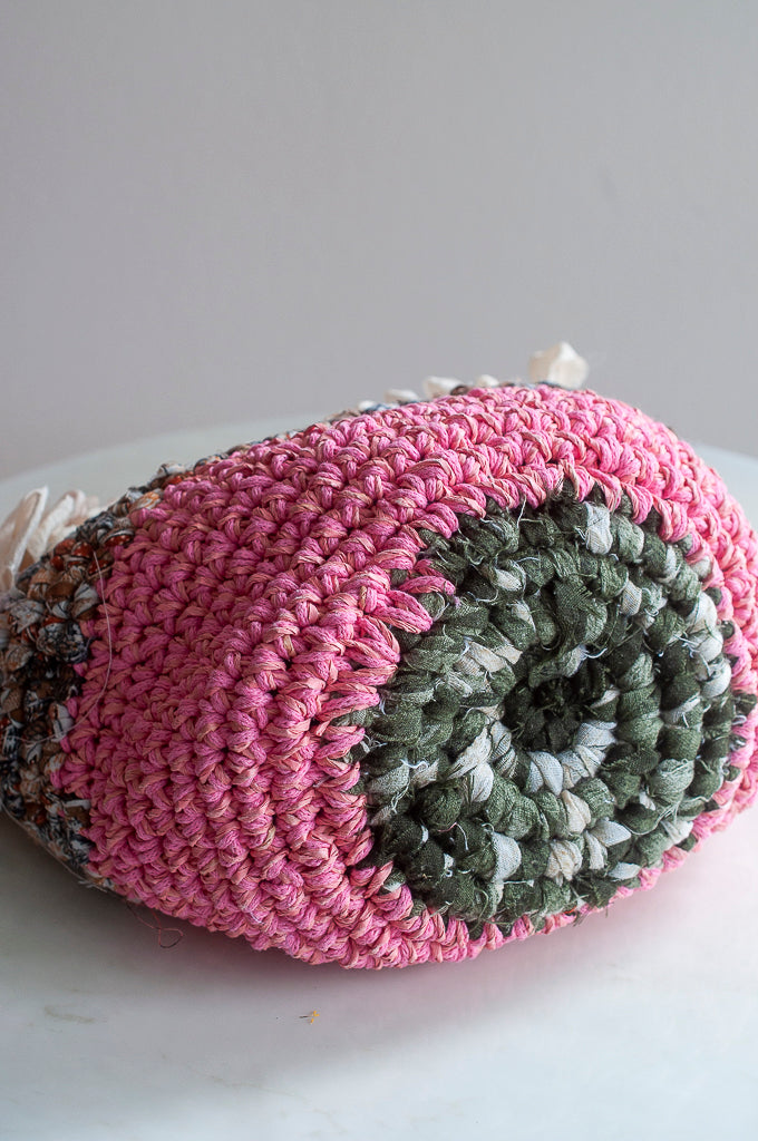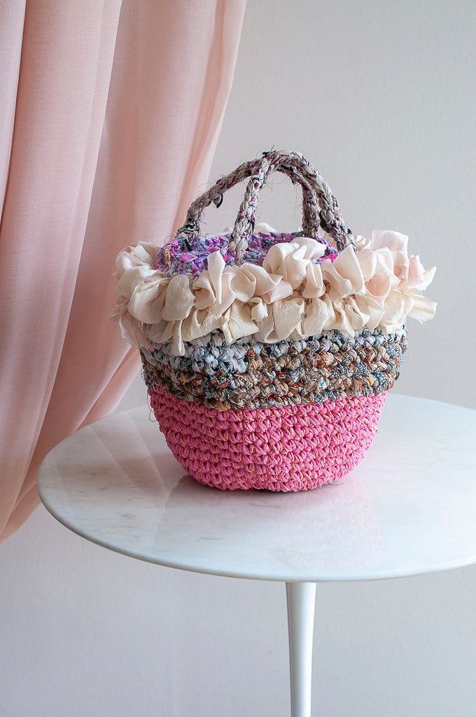 Sie ist entstanden aus Resten alter Seide, alten Kopftüchern, die die Frauen in unserem Partnerprojekt in Griechenland in zwei alten Koffern fanden und Resten von Papiergarn. Dadurch ist sie federleicht und sehr schön zu tragen - allerdings nur bedingt waschbar. Sie möchte aber auch gar nicht gewaschen werden, sondern getragen - abends oder tagsüber als It-Piece. Unsere gehäkelten Taschen aus Recyclingmaterial sind einzigartig und nur begrenzt verfügbar. Jede ist ein Unikat.