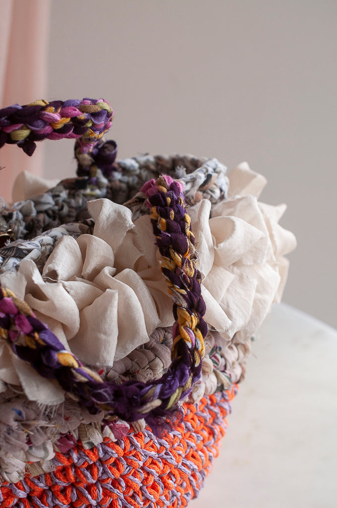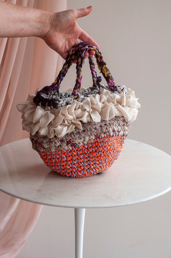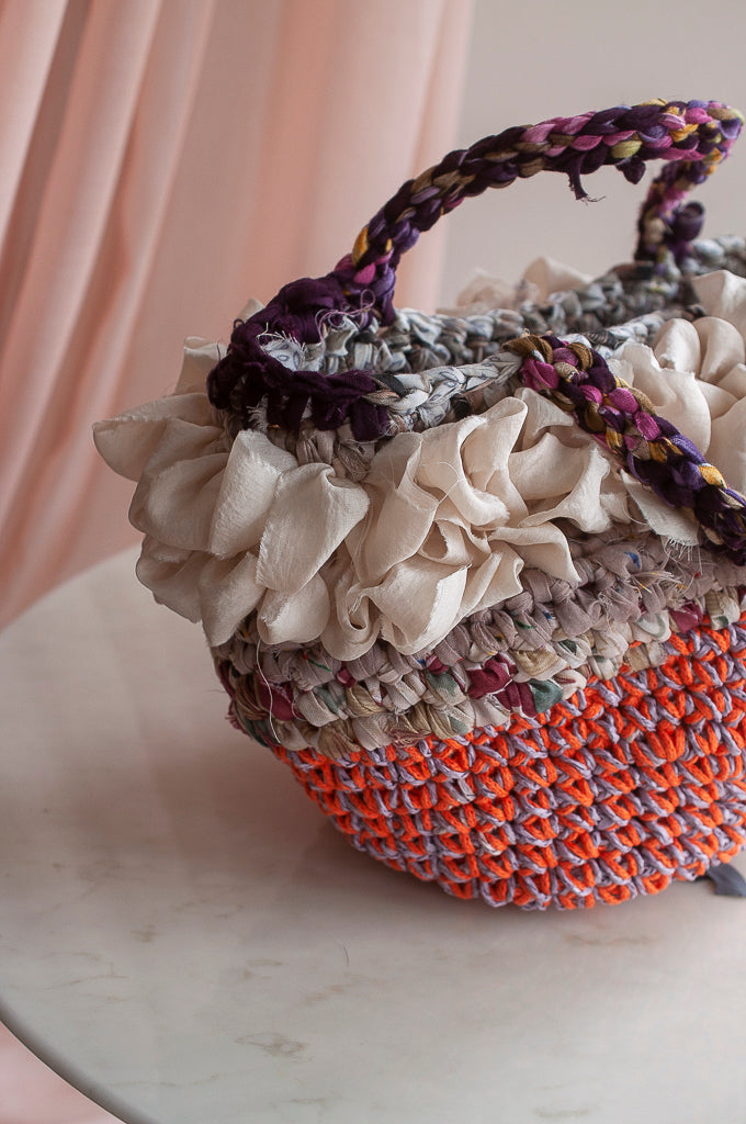 Sie ist entstanden aus Resten alter Seide, alten Kopftüchern, die die Frauen in unserem Partnerprojekt in Griechenland in zwei alten Koffern fanden und Resten von Papiergarn. Dadurch ist sie federleicht und sehr schön zu tragen - allerdings nur bedingt waschbar. Sie möchte aber auch gar nicht gewaschen werden, sondern getragen - abends oder tagsüber als It-Piece. Unsere gehäkelten Taschen aus Recyclingmaterial sind einzigartig und nur begrenzt verfügbar. Jede ist ein Unikat.
